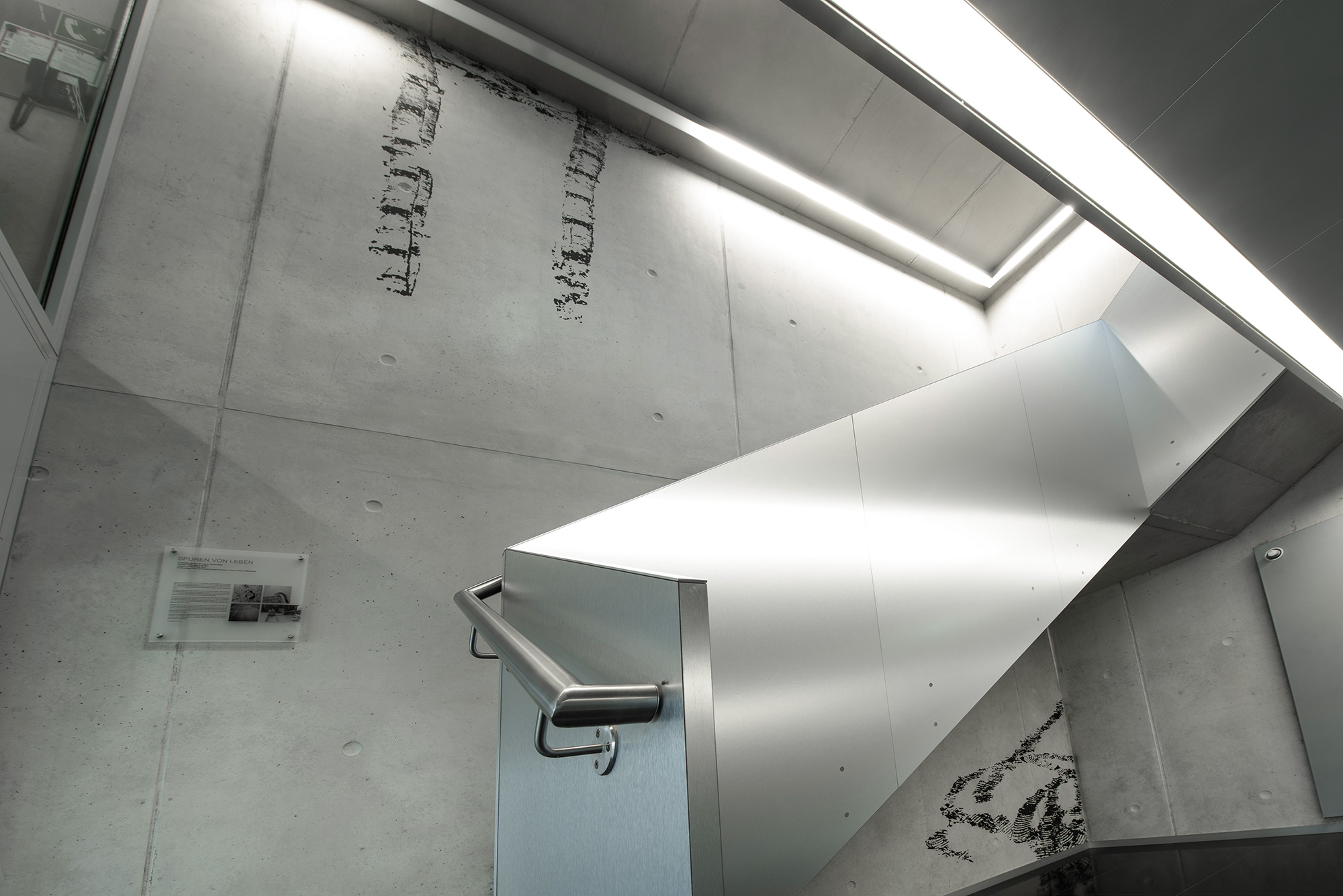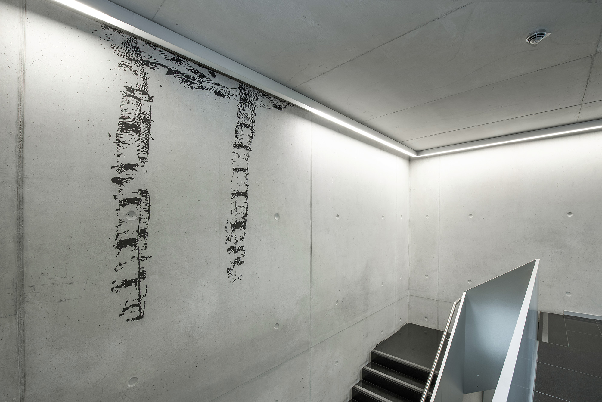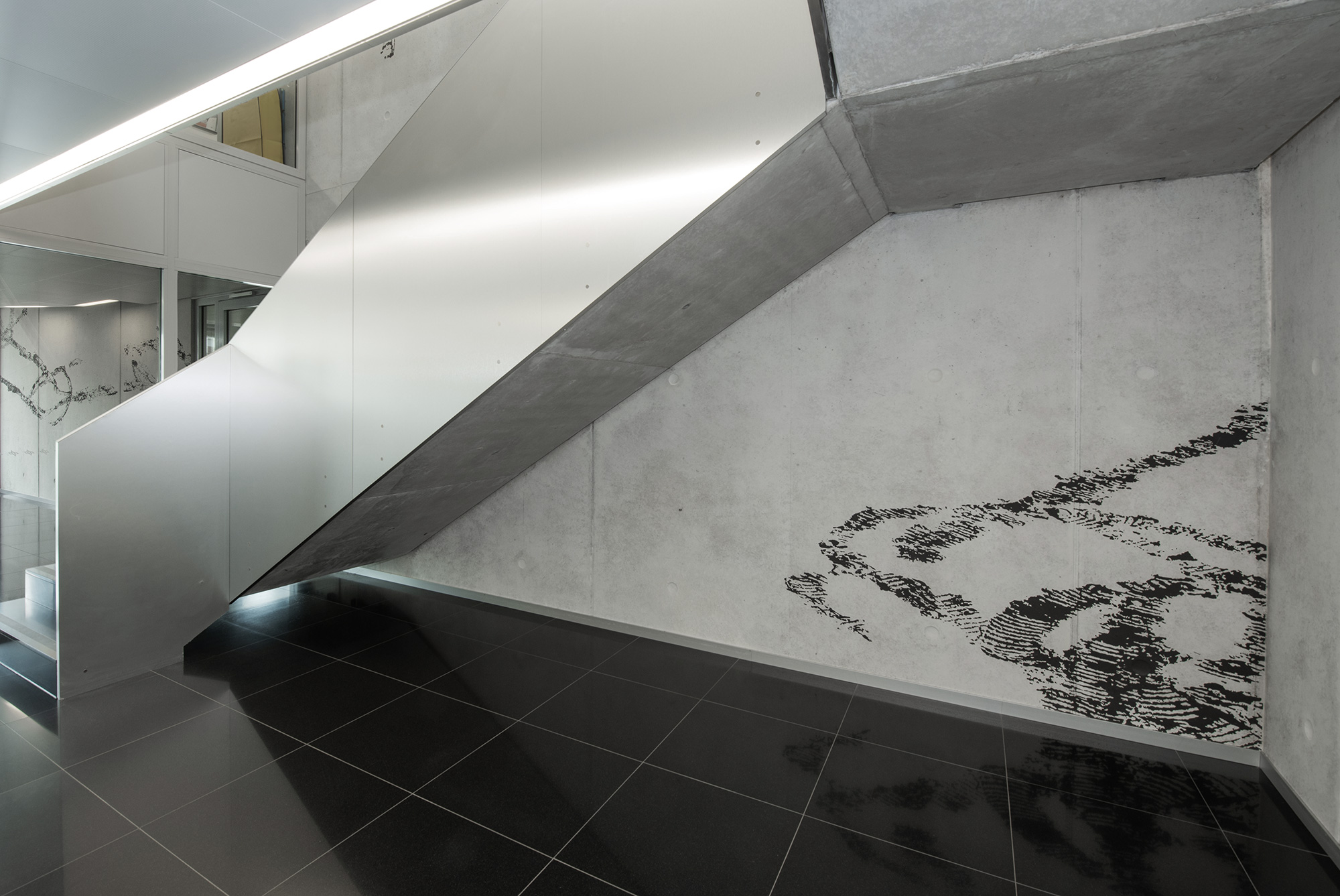 Ausgehend von Fotografien der Roverfährten auf dem Mars wurden im Systemhaus Technik Bilder von Fahrspuren direkt auf die Wände aufgebracht. Spuren im Sand sind unbeständig. Während Marsstürme sie verwischen, gibt die Kunst am Bau den flüchtigen Zeichen Dauer und Bestand.