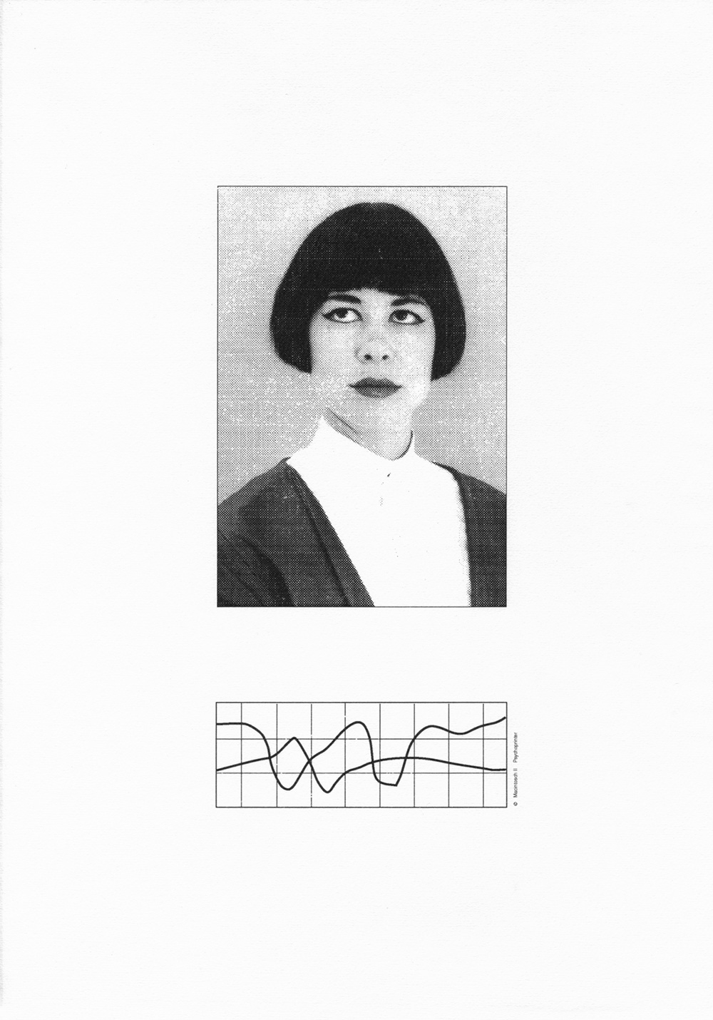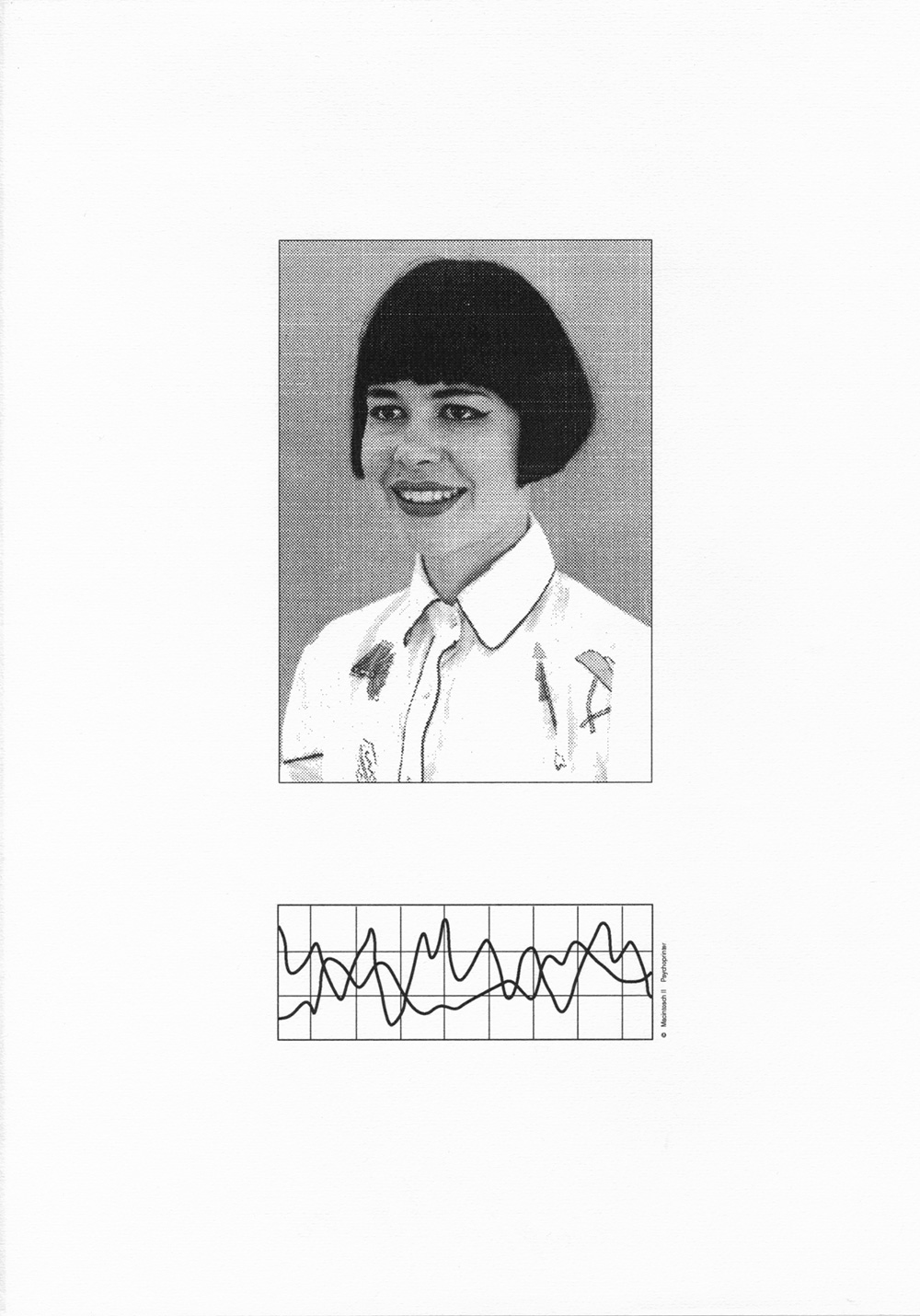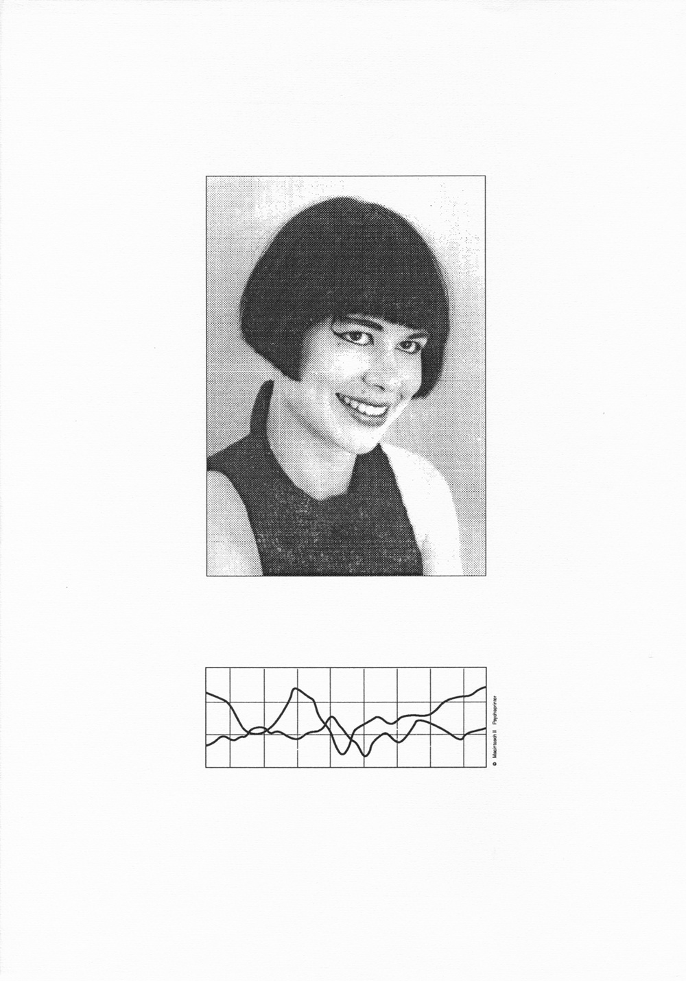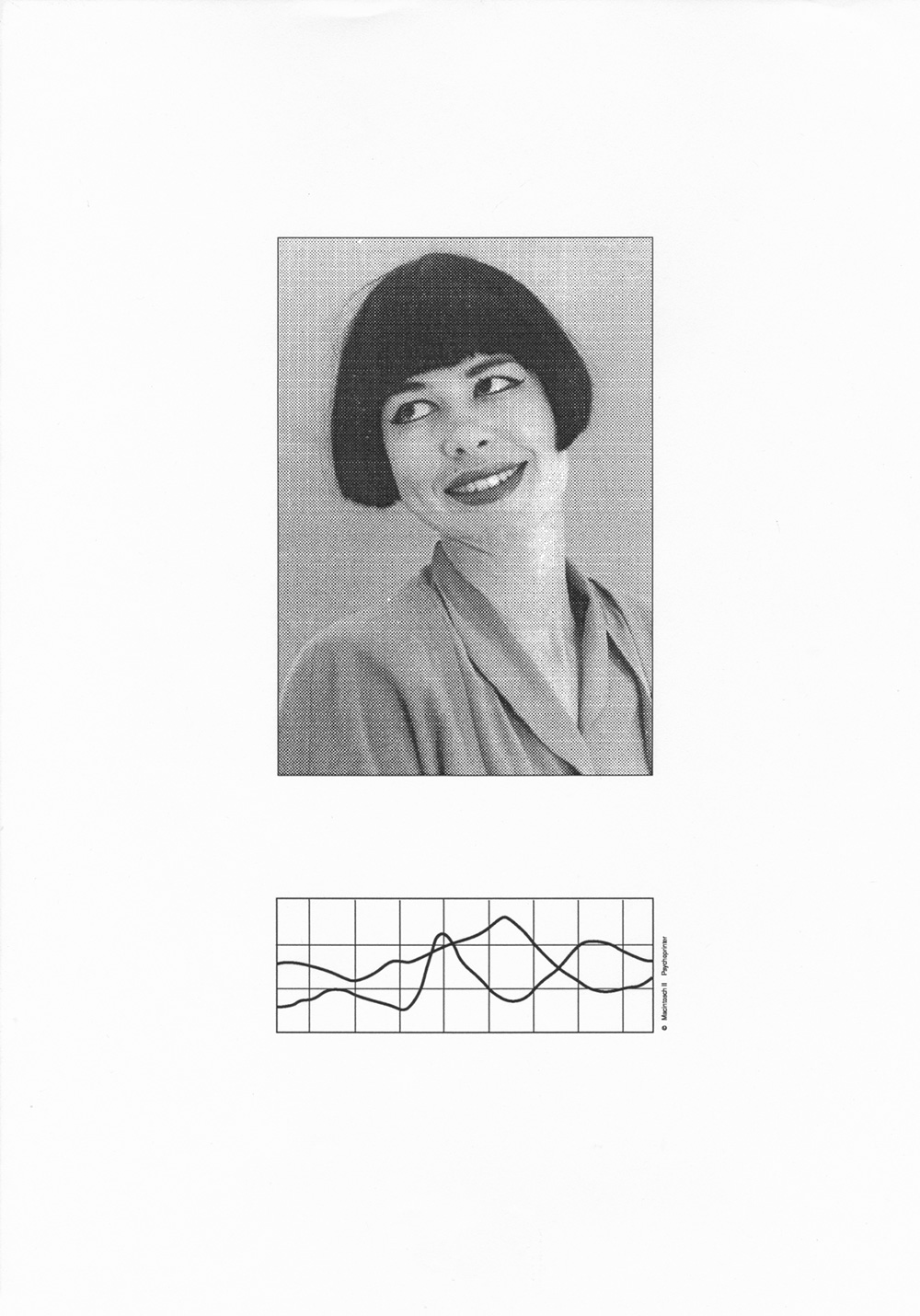 Unter den Fotos sind Kurven eines „Psychoprinters“ zu sehen, der Haltung und Ausdruck zu interpretieren scheint und die Vorstellung suggeriert, Persönlichkeit ließe sich aus fotografischen Oberflächen herauslesen.