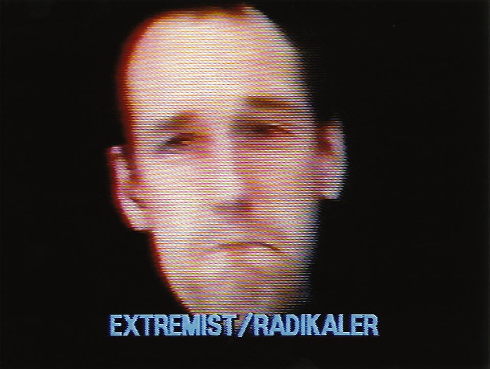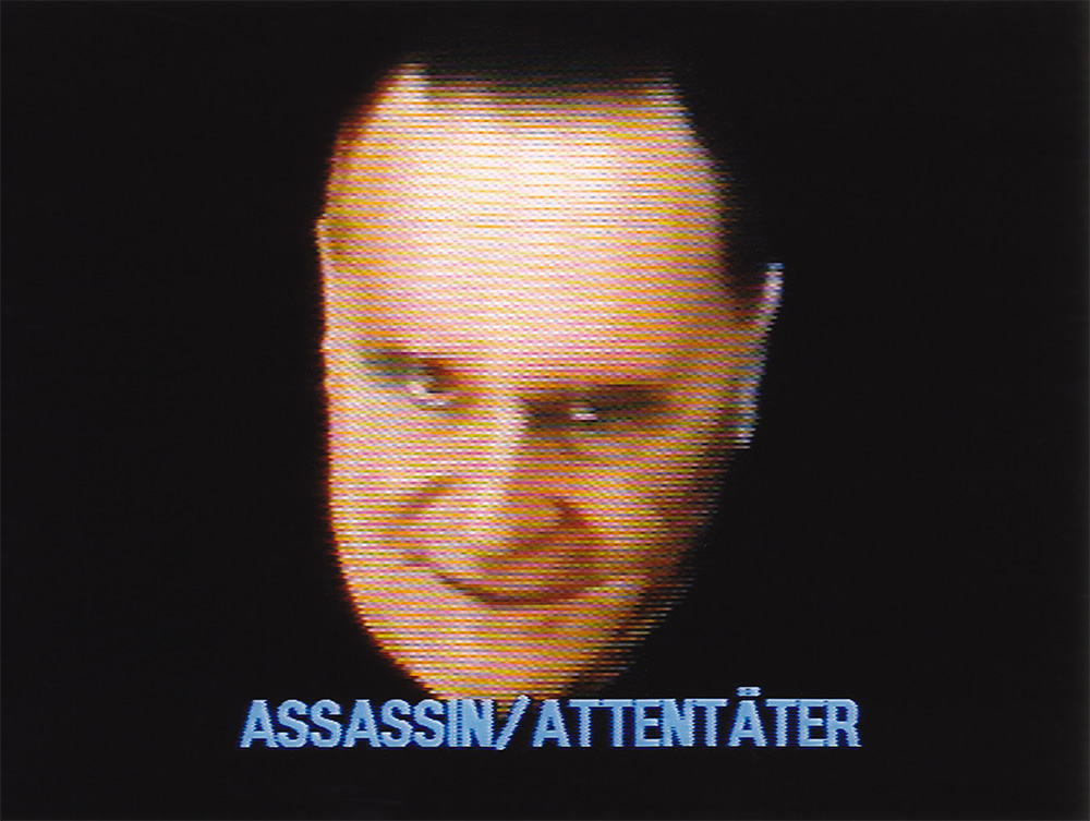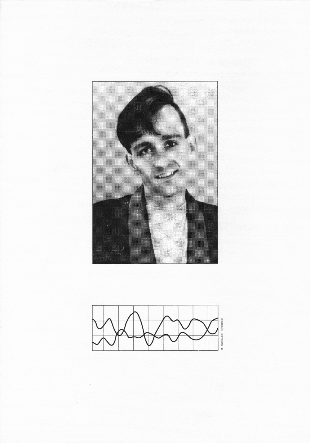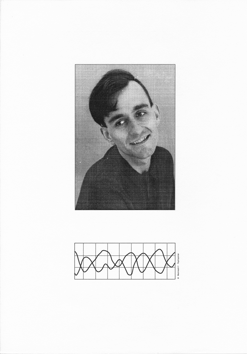 Unter den Fotos sind Kurven eines „Psychoprinters“ zu sehen, der Haltung und Ausdruck zu interpretieren scheint und die Vorstellung suggeriert, Persönlichkeit ließe sich aus fotografischen Oberflächen herauslesen.
