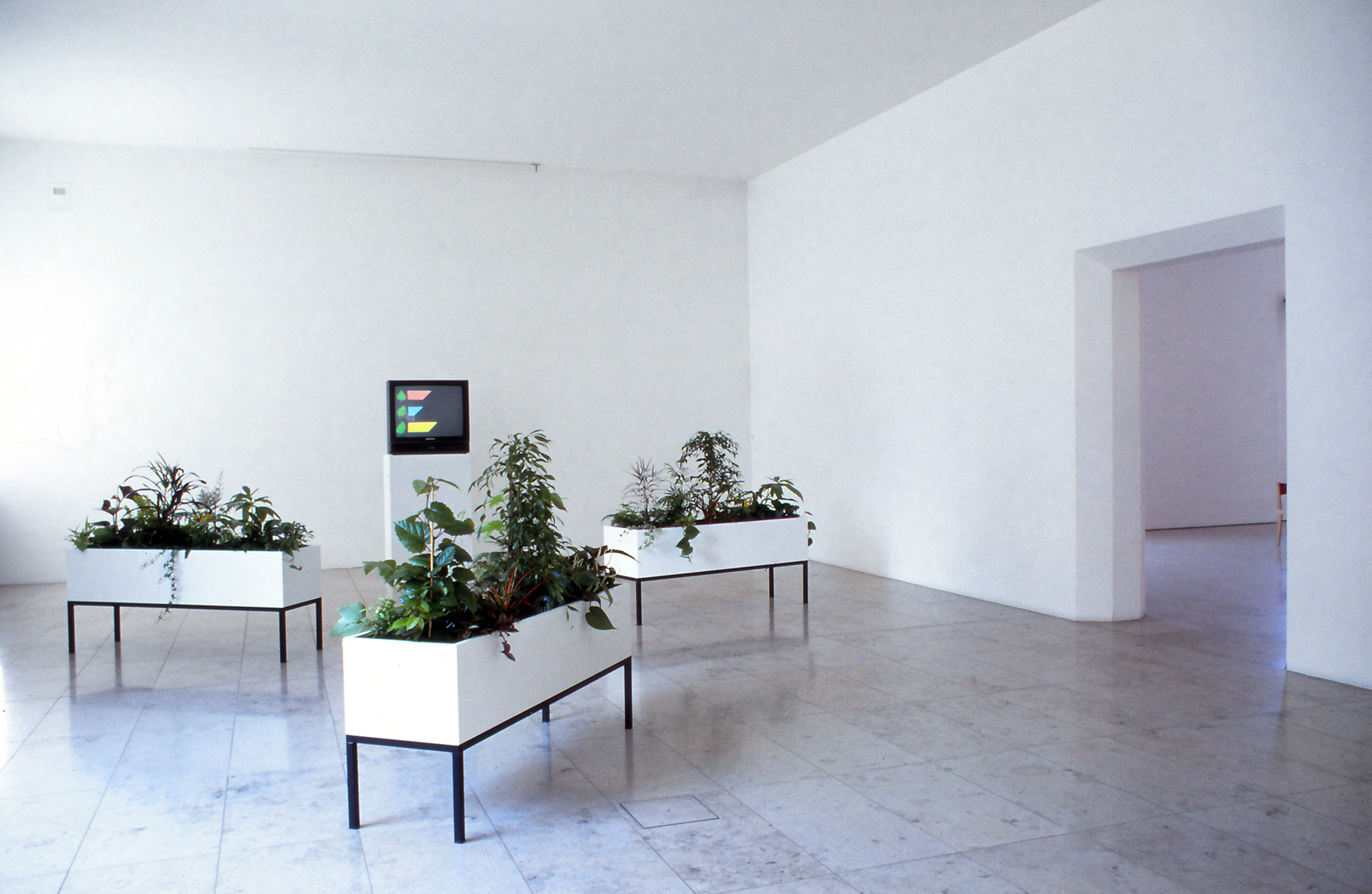 Im Raum EXPERIMENT gruppierten wir drei Pflanzkästen um einen Monitor. Darauf war die Computeranimation einer langsam rotierenden Topfpflanze zu sehen; zu synthetischen Klängen lief am unteren Bildrand eine Kurve. Diagramme und Grafiken zu Wachstum und geografischer Verbreitung der Pflanze ergänzten die Animation zu einem „Lehrfilm“.