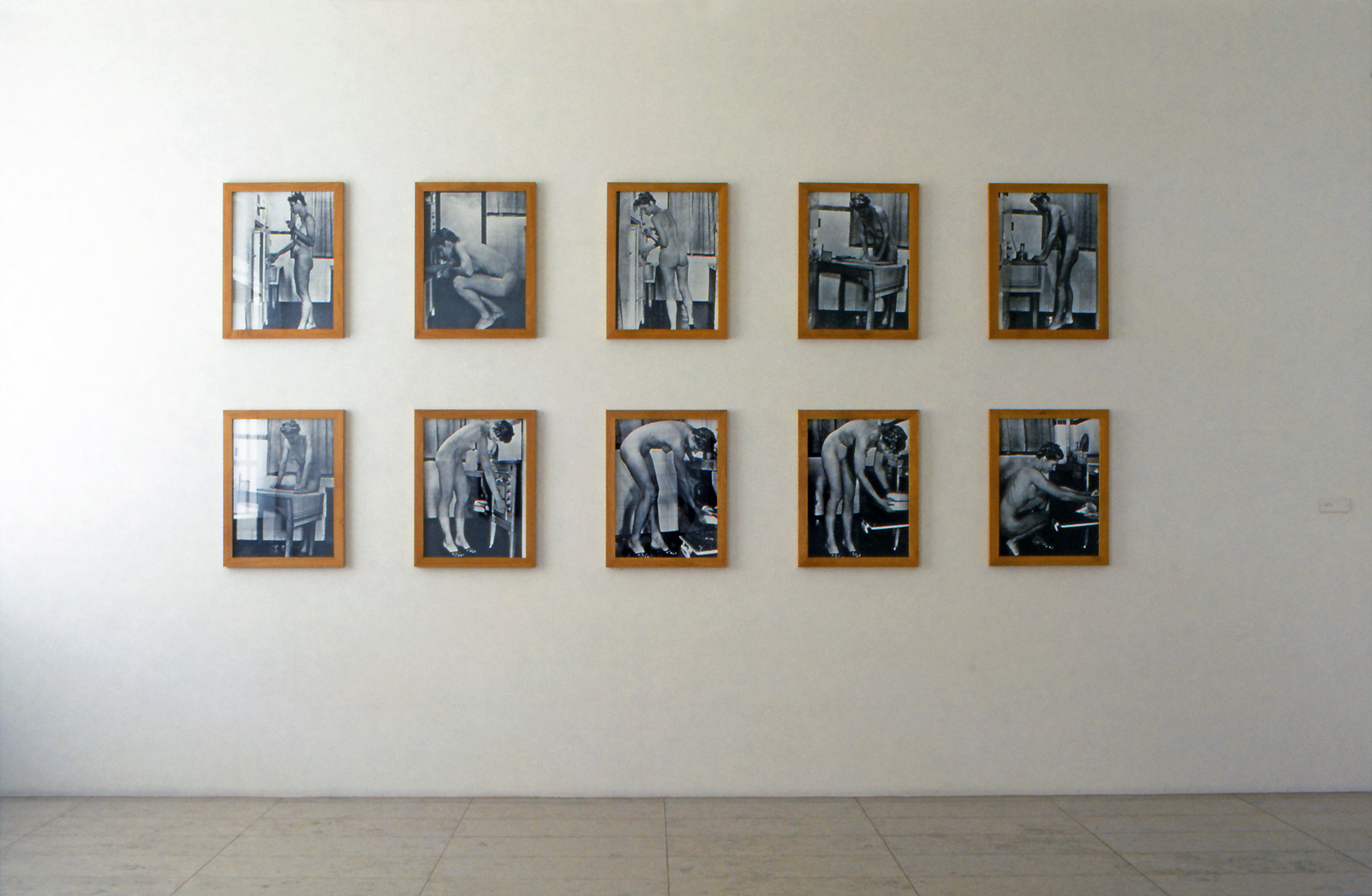Den Professoren gegenüber hing die achtteilige Fotoserie KÜNSTLERMODELLE, die ein weibliches Aktmodell bei hausfraulichen Verrichtungen in einer Küche zeigte – Motive, die wir in einem Buch für Künstler mit Aktfotografien von John Everard aus den 1950er Jahren entnommen hatten.