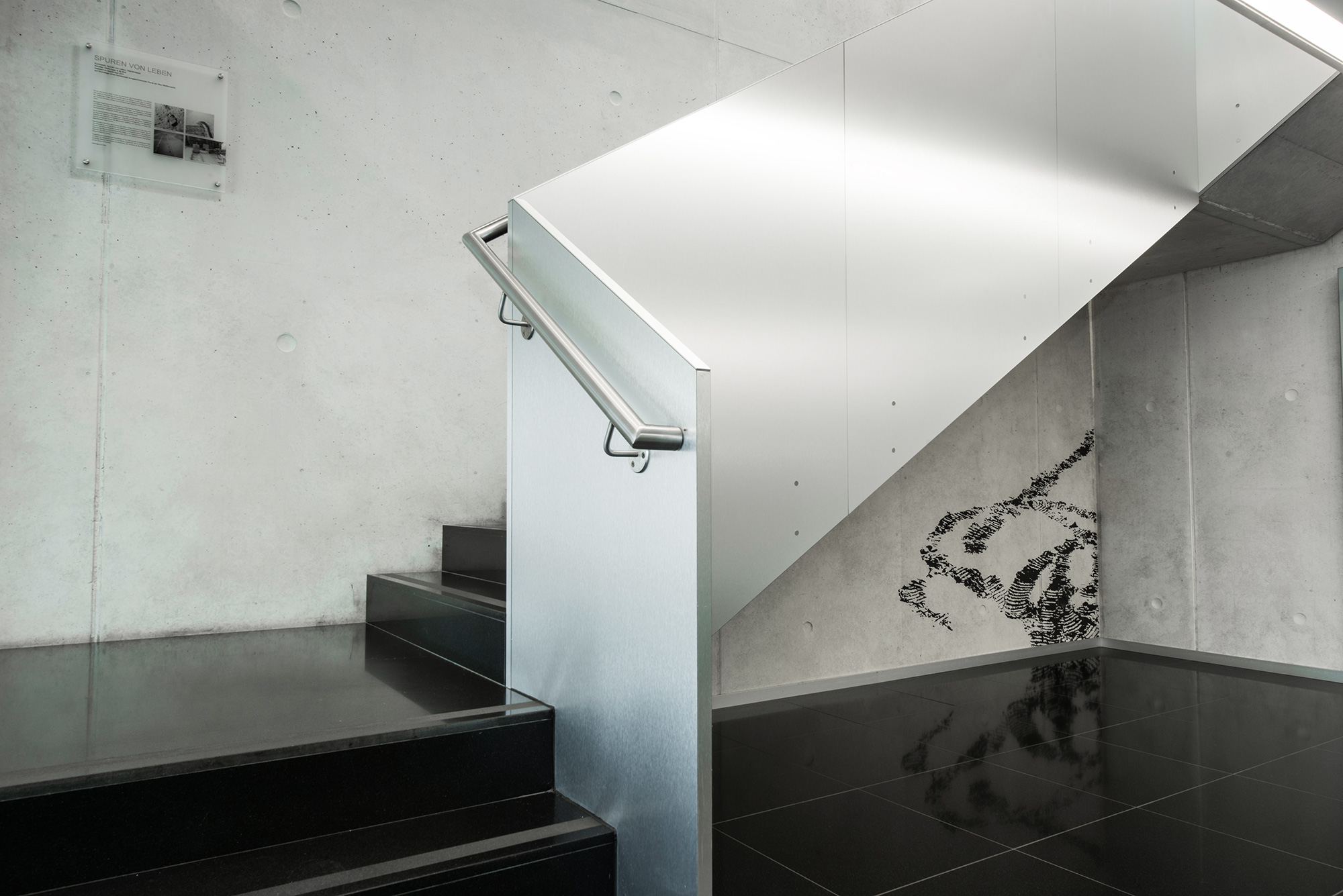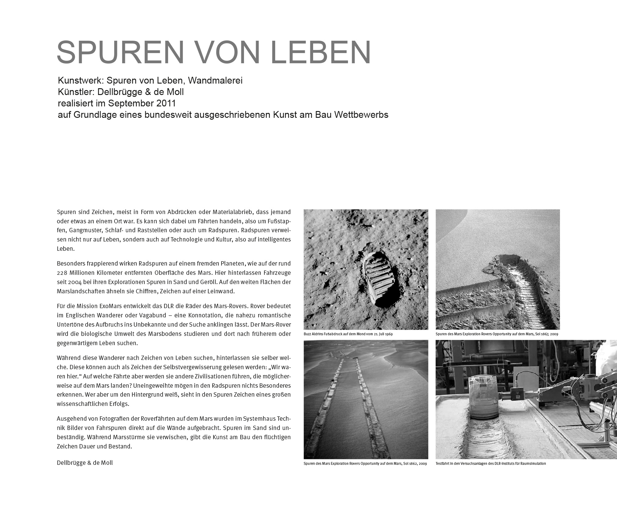 … Die der Kunst überantworteten Bilder der Fahrspuren in Sand und Staub des Mars sind wie Fußspuren auf der Erde: absichtslose Zeichen, die wieder verschwinden. Die Wandbilder im Systemhaus Technik knüpfen als universelle Sinnbilder an die metaphorische Weite der bildlichen und sprachbildlichen Erscheinungsformen von „Spuren“ an und werfen existentielle Fragen auf: Woher kommen wir? Wer sind wir? Wohin gehen wir?